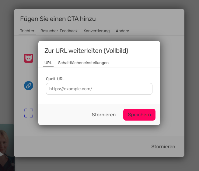 Wenn du auf CTA hinzufügen klickst, erscheint ein Modal, das fragt, welchen Typ von CTA du hinzufügen möchtest. Die Optionen sind:
